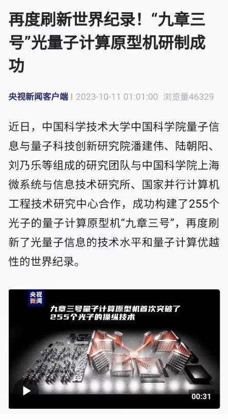 據央視新聞報道,近日,我國成功構建了 255 個(gè)光子的量子計算原型機“九章三號”,再度刷新了光量子信息的技術(shù)水平和量子計算優(yōu)越性的世界紀錄。