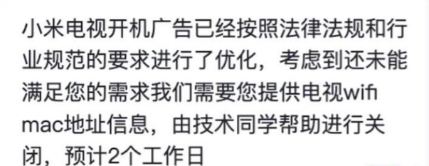而目前小米電視據稱(chēng)也可以“永久關(guān)閉開(kāi)屏廣告”,用戶(hù)可以在小米商城 App 中接入人工客服,并提供電視的 MAC 地址,在提交后預計 2-3 個(gè)工作日內,開(kāi)機廣告就會(huì )被永久關(guān)閉。
