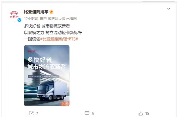比亞迪昨晚在江蘇淮安發(fā)布了混動(dòng)輕卡新品 T5,該車(chē)首發(fā)搭載 DM 1.5 混動(dòng)系統,號稱(chēng)滿(mǎn)載狀態(tài)下 0-50km/h加速 5.5 秒,滿(mǎn)油滿(mǎn)電狀態(tài)最高續航 1000km。