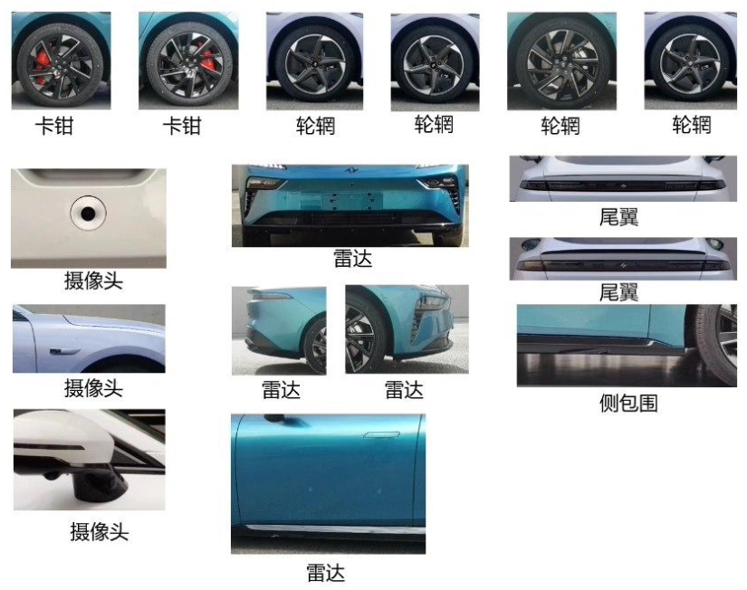 選裝件包括紅色卡鉗、尾翼、側包圍等,以及不同樣式的輪輞,可選不同位置攝像頭、雷達。