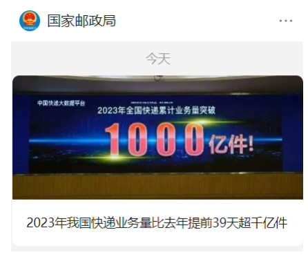 國家郵政局今日官宣,國家郵政局快遞大數據平臺實(shí)時(shí)監測數據顯示,10 月 23 日上午 7 時(shí) 39 分,2023 年我國第 1000 億件快件產(chǎn)生,比 2022 年達到千億件提前了 39 天時(shí)間。