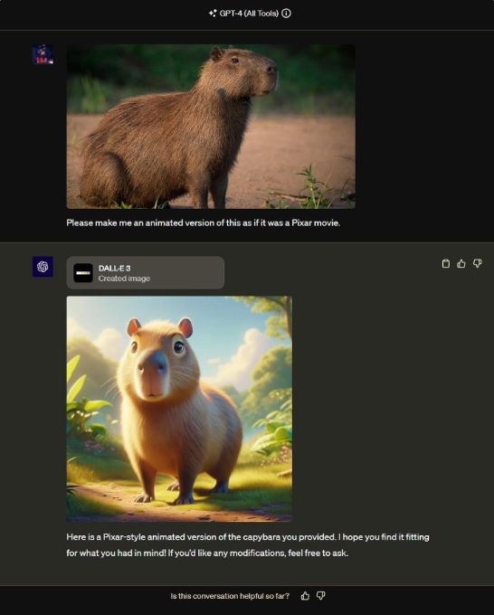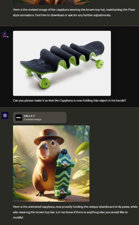 ChatGPT 新功能不僅限于處理文本文件。在 Threads 上,有用戶(hù)發(fā)布了一段對話(huà)的截圖,他們上傳了一張水豚的圖片,ChatGPT 可以通過(guò) DALL-E 3 根據它創(chuàng )建一個(gè)皮克斯風(fēng)格的圖片。然后他們又上傳了另一張圖片,這次是一塊扭曲的滑板,并要求 ChatGPT 將它插入上述圖片,ChatGPT 也成功做到了,不知道為什么還給水豚戴上了帽子。
