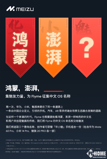 據悉,魅族向用戶(hù)整機Flyme的中文OS命名,之后會(huì )選取三個(gè)意向名,創(chuàng )作者可獲贈“華小魅”手機組合一份(包含華為Mate 60 Pro、小米14 Pro、魅族 20 PRO各一部)。