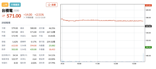 全球最大芯片代工廠(chǎng)臺積電10月?tīng)I收自今年2月以來(lái)首次同比正增長(cháng),半導體行業(yè)拐點(diǎn)到了?臺積電臺股股價(jià)今日一度漲逾4.1%,至580元新臺幣,為5月以來(lái)最大單日漲幅。