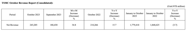 11月10日周五,臺積電公布10月?tīng)I收報告。報告顯示,10月臺積電合并營(yíng)收為2432.03億元新臺幣(約合549.64億元人民幣),環(huán)比增長(cháng)34.8%,較上年同期增長(cháng)15.7%,而這也為臺積電自今年2月以來(lái)單月?tīng)I收首次同比正增長(cháng)。