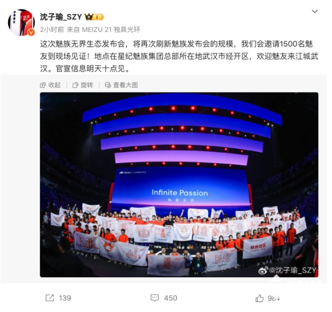 近日,星紀魅族集團董事長(cháng)兼CEO沈子瑜在社交媒體發(fā)文稱(chēng),將于11月20日召開(kāi)魅族無(wú)界生態(tài)發(fā)布會(huì ),會(huì )邀請1500名魅友到現場(chǎng)見(jiàn)證,“將再次刷新魅族發(fā)布會(huì )的規模”。此次發(fā)布會(huì )上,魅族或將推出魅族21系列手機。