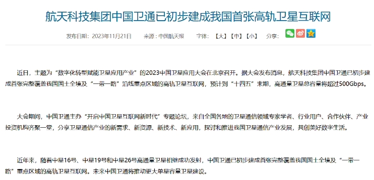 航天科技集團中國衛通已初步建成我國首張高軌衛星互聯(lián)網(wǎng)