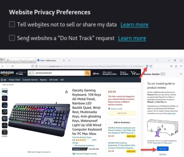 Firefox 添加了“網(wǎng)站隱私偏好”選項,號稱(chēng)可以告訴網(wǎng)站“不要出售或共享用戶(hù)數據”,此外還引入了“Review Checker”AI 工具,可用于識別電商平臺虛假評論,此外 Firefox 120 不再支持 iOS14 系統。