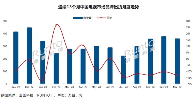 根據洛圖科技發(fā)布的《中國電視市場(chǎng)品牌出貨月度快報》數據顯示,2023 年 11 月,中國電視市場(chǎng)出貨總量達 357 萬(wàn)臺,環(huán)比 10 月下降 4.5%,同比去年下降達 13.2%。