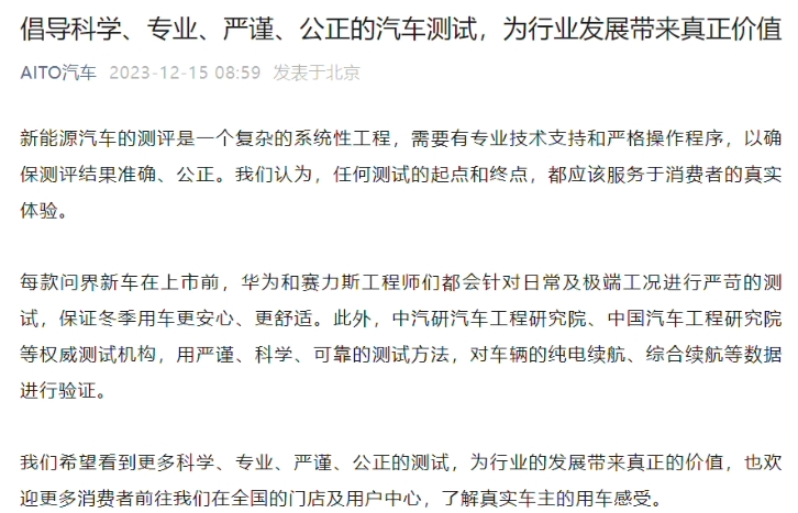 AITO 汽車(chē)今日在官方公眾號發(fā)文表示,新能源汽車(chē)的測評是一個(gè)復雜的系統性工程,需要有專(zhuān)業(yè)技術(shù)支持和嚴格操作程序,以確保測評結果準確、公正。AITO 認為,任何測試的起點(diǎn)和終點(diǎn),都應該服務(wù)于消費者的真實(shí)體驗。