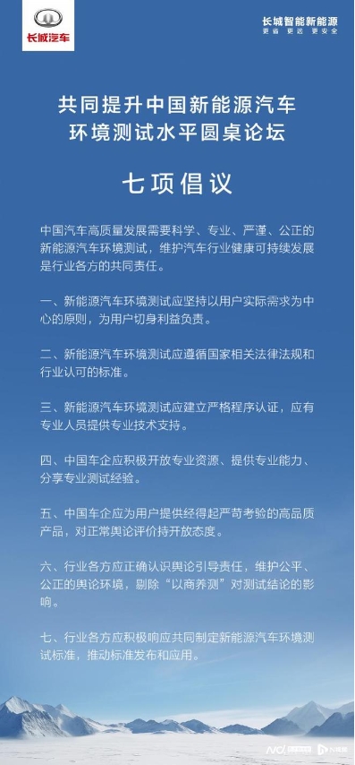 12 月 14 日,長(cháng)城汽車(chē)舉行倡議關(guān)于“共同提升中國新能源汽車(chē)環(huán)境測試水平”的圓桌論壇?;顒?dòng)現場(chǎng),長(cháng)城汽車(chē)提出了七項倡議,包括新能源汽車(chē)環(huán)境測試應建立嚴格程序認證,應有專(zhuān)業(yè)人員提供專(zhuān)業(yè)技術(shù)支持等,并宣布向全行業(yè)開(kāi)放所有“新能源汽車(chē)測試平臺”,倡議其他車(chē)企開(kāi)放測試資源,共同支持中國汽車(chē)高質(zhì)量發(fā)展和高質(zhì)量測試,推動(dòng)更加專(zhuān)業(yè)、嚴謹的“新能源汽車(chē)環(huán)境測試標準”,呼吁早日出臺。