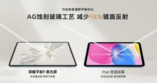 榮耀平板9搭載的紙感護眼柔光屏,屏幕表面通過(guò)榮耀自研的AG蝕刻玻璃工藝,產(chǎn)生微不可察的極小“起伏”形態(tài),從而將強光源直射所產(chǎn)生的鏡面反射轉化為柔和的漫反射,達到能夠消除98%的鏡面反射光的效果,實(shí)現紙感護眼的讀寫(xiě)體驗。
