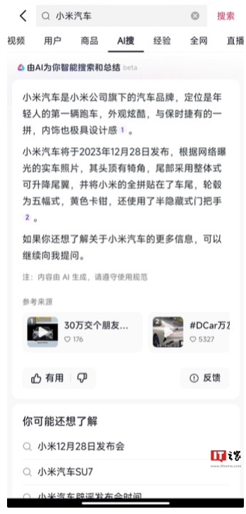 “AI 搜”功能位于抖音 App 的搜索界面內,與其他搜索服務(wù)如商品、團購、用戶(hù)、視頻等并列。用戶(hù)只需在“AI 搜”內輸入相關(guān)的問(wèn)題或信息,就可以得到“AI 搜”通過(guò)智能搜索技術(shù)為用戶(hù)生成的回答?;卮鸬膬热莶粌H來(lái)源于抖音內的優(yōu)質(zhì)視頻,還包括第三方網(wǎng)站的信息,并且提供了跳轉鏈接,方便用戶(hù)查看更多的細節和講解。此外,“AI 搜”還可以根據用戶(hù)的問(wèn)題,給出用戶(hù)可能感興趣的相關(guān)問(wèn)題。