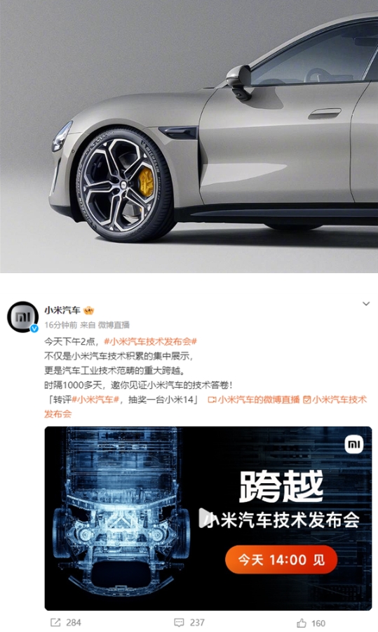小米汽車(chē)表示,“今天下午2點(diǎn),小米汽車(chē)技術(shù)發(fā)布會(huì )不僅是小米汽車(chē)技術(shù)積累的集中展示,更是汽車(chē)工業(yè)技術(shù)范疇的重大跨越,時(shí)隔1000多天,見(jiàn)證小米汽車(chē)的技術(shù)答卷。”