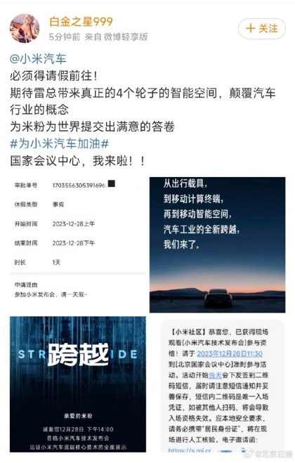 這些米粉花式請假參加小米汽車(chē)技術(shù)發(fā)布會(huì ),不僅反映了小米品牌強大的粉絲凝聚力,也揭示了消費者、業(yè)內對于小米首款汽車(chē)的高度關(guān)注和期待。