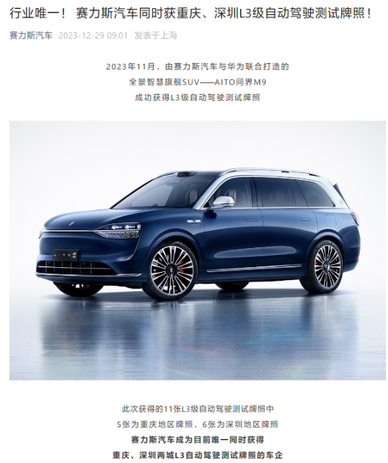 賽力斯汽車(chē)獲重慶、深圳 L3 級自動(dòng)駕駛測試牌照,問(wèn)界 M9 可在特定區域開(kāi)啟路測
