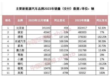 銷(xiāo)量前十的新能源品牌是:比亞迪、埃安、理想、長(cháng)城汽車(chē)、蔚來(lái)、賽力斯、零跑、小鵬、哪吒、極氪。其中,傳統車(chē)企創(chuàng )二代表現亮眼,年銷(xiāo)量普遍同比大增?! ?/p>
