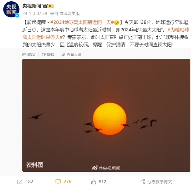 2024“最大太陽(yáng)”:今天是地球本年度離太陽(yáng)最近的一天