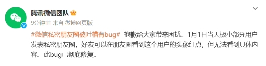網(wǎng)絡(luò )上有人吐槽微信私密朋友圈有 bug,騰訊微信團隊發(fā)文致歉,并表示此 bug 已徹底修復。