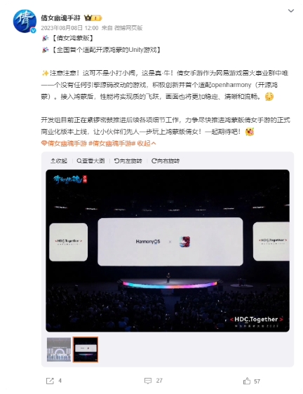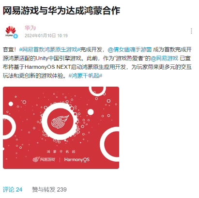 華為官方今日宣布:網(wǎng)易首款鴻蒙原生游戲《倩女幽魂手游》完成開(kāi)發(fā),成為首款完成開(kāi)源鴻蒙適配的 Unity 中國引擎游戲。
