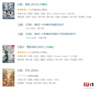 電影《白蛇:緣起》于 2019 年上映,目前豆瓣評分 7.8;《白蛇:青蛇劫起》于 2021 年上映,目前豆瓣評分 6.8。
