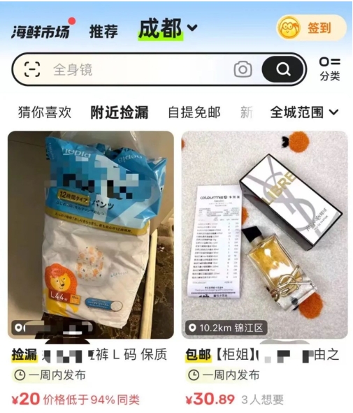 可見(jiàn)原本閑魚(yú)近場(chǎng)交易的屬性本就較強。據《新立場(chǎng)》觀(guān)察,閑魚(yú) APP 不僅有本地推薦頁(yè)模塊,該模塊內還有細分的“附近撿漏”、“自提免郵”等模塊,點(diǎn)擊進(jìn)入“附近撿漏”模塊,可以刷到附近 5 公里 10 公里等范圍內的閑置商品,但其不會(huì )顯示具體社區名字的定位。