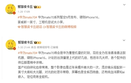 硬剛iPhone 16!曝華為Mate 70將于9月發(fā)布:搭載國產(chǎn)一英寸主攝