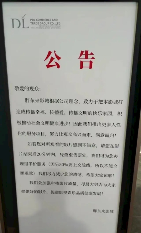 影城公告牌上寫(xiě)到,如果對影片不滿(mǎn)意,可以在看完后20分鐘內,去售票處退款50%,并解釋另外50%要上交院線(xiàn),所以不能全額退款。