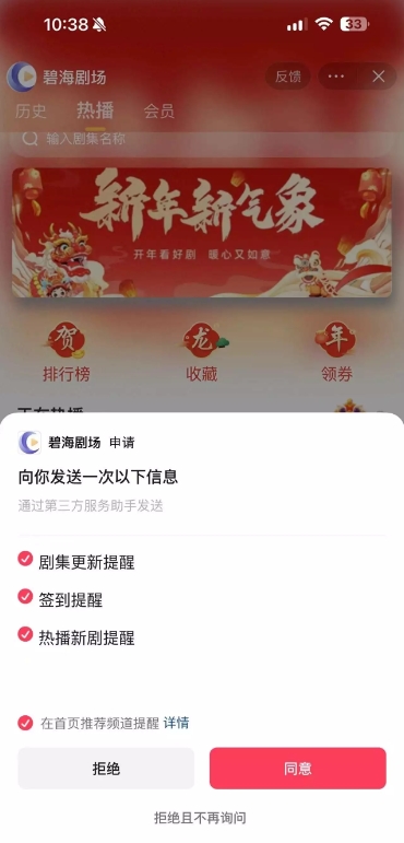 包括劇集更新提醒,簽到提醒,熱播新劇提醒,甚至還申請在首頁(yè)推薦頻道提醒權限。