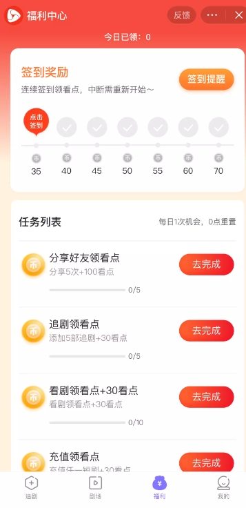 簽到提醒頁(yè),主要讓用戶(hù)每天打卡簽到,獲取看點(diǎn)值,可以抵消看劇消耗,維持小程序活躍度和培養用戶(hù)登錄習慣。