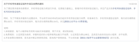 去年8月,還有另一份關(guān)于微信小程序的與手機號獲取相關(guān)的公告,也已在當下發(fā)生了影響。即小程序手機號快速驗證能力,面向開(kāi)發(fā)者(即品牌商家)收費。