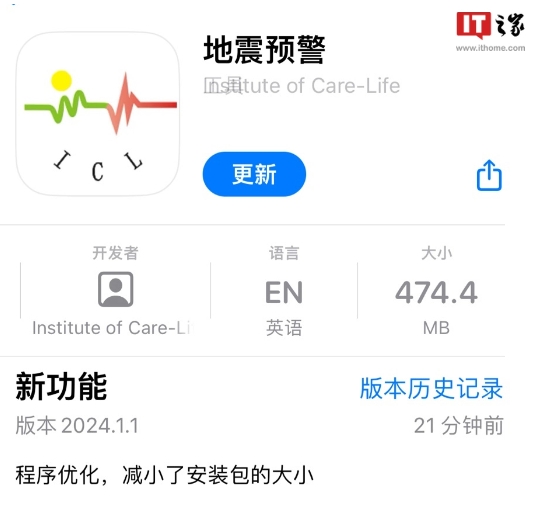 之前有報道稱(chēng) iOS“地震預警”App 更新后體積暴增至 1.17GB 的消息,而該 App 發(fā)布了 2024.1.1 版本更新,體積相比之前一版“暴瘦”至 474.4MB,官方更是將減小了安裝包的大小寫(xiě)進(jìn)了更新日志中。
