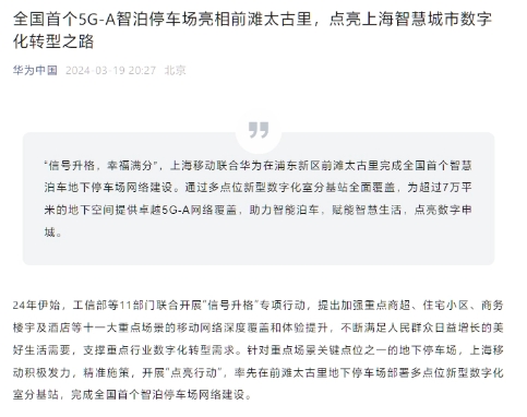 華為、上海移動(dòng)聯(lián)合打造,全國首個(gè) 5G-A 智慧停車(chē)場(chǎng)亮相:可節省超 30 分鐘停取車(chē)時(shí)間