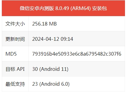 微信安卓平臺迎來(lái)了 8.0.49 測試版更新,本次更新安裝包文件詳細信息如下: