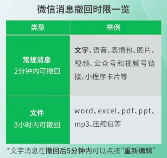包括文字、語(yǔ)音、圖片、表情包、視頻公眾號、視頻號鏈接、小程序內容均可在 2 分鐘內撤回,其中文字消息可以在撤回 5 分鐘內重新編輯,避免大家重新打字;包含 Word、Excel、PDF、PPT、MP3、壓縮包等文件 3 小時(shí)內可以撤回。