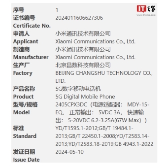認證顯示,該機最高支持 67W 快充,由北京昌數科技有限公司生產(chǎn),也就是小米自己的生產(chǎn)廠(chǎng)。