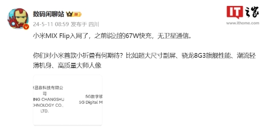 小米首款豎向折疊手機 MIX Flip 入網(wǎng),67W 快充