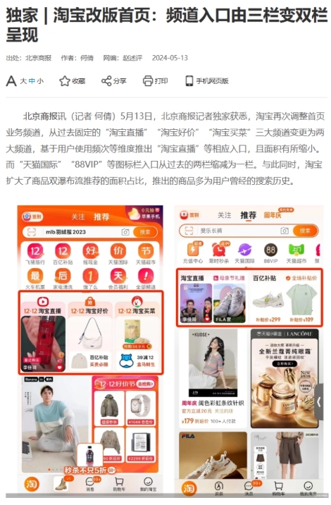 北京商報報道稱(chēng),淘寶內部人士表示目前淘寶 App 首頁(yè)會(huì )根據用戶(hù)日常使用習慣、用戶(hù)所在區域等因素進(jìn)行動(dòng)態(tài)調整,以提升淘寶首頁(yè)對用戶(hù)匹配的精準度,這導致不同用戶(hù)的淘寶首頁(yè)會(huì )有所不同。