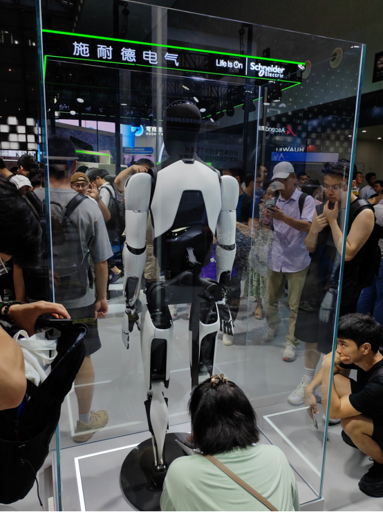 7月6日的WAIC展會(huì )上,展館內的很多設置、展品,對普通觀(guān)眾都非常友好。頗為吸睛的“十八金剛”人形機器人先鋒陣列,擺放在最顯眼的入口處,各式各樣的人形機器人引發(fā)觀(guān)眾連連驚嘆。