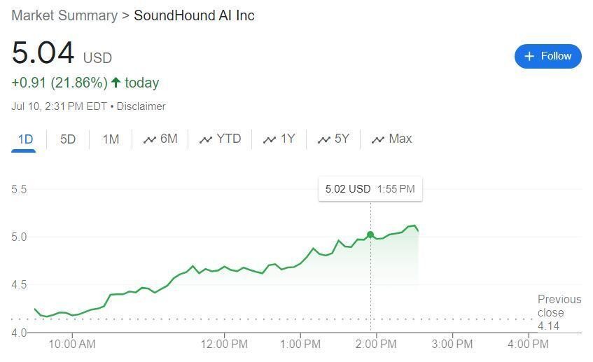 消息傳出后,SoundHound股價(jià)加速上行,美股午盤(pán)漲幅擴大到20%以上,勢將5月31日以來(lái)首次收盤(pán)漲破5.0美元。